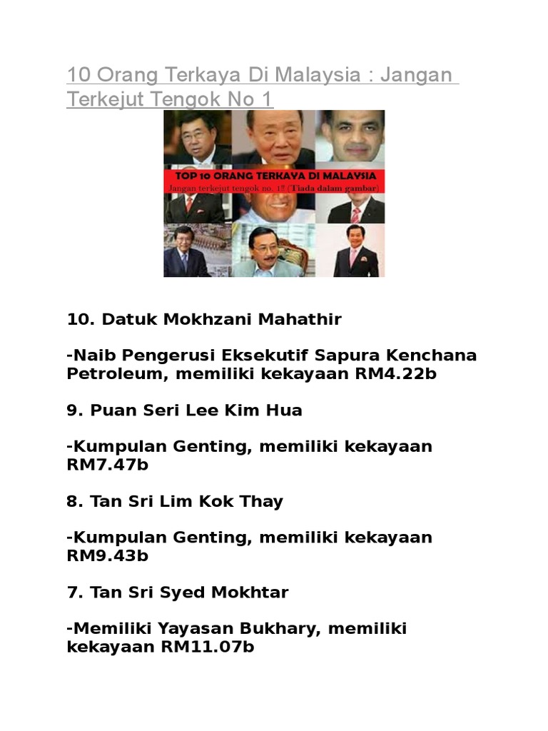 Savesave 10 orang terkaya di malaysia for later. Daftar 50 orang terkaya di indonesia update terbaru versi majalah forbes. Tampaknya, bisnis rokok masih sangat berjaya itulah deretan sosok atau orang terkaya di indonesia yang berhasil mencatatkan namanya dalam majalah forbes. Top 10 tempat paling berhantu di dunia. Ini disebabkan gabungan beberapa faktor seperti keadaan ekonomi yang perlahan, kemerosotan hampir 10% dalam indeks pasaran saham.